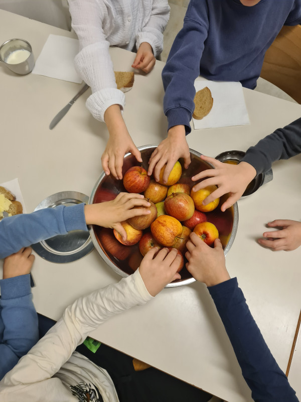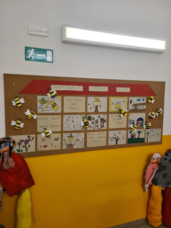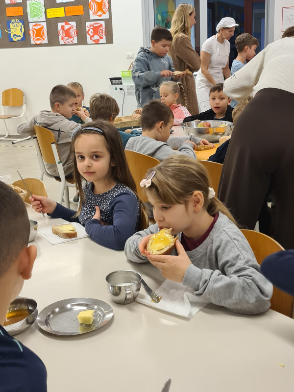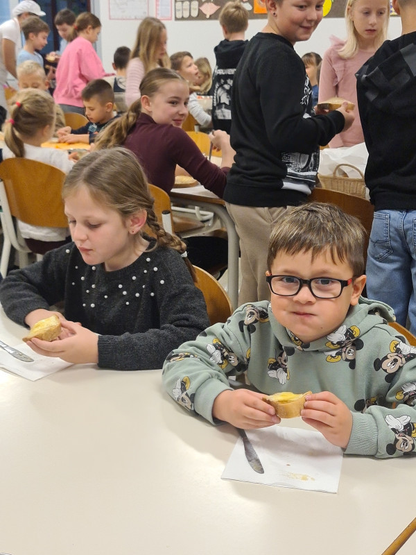V popoldanskih dejavnostih so učenci pripravili pano, na katerem so ponazorili pomen lokalnih živil, ter se pogovarjali o tem, zakaj je pomembno, da jemo zdravo in domače pridelano hrano. V petek zjutraj smo se vsi zbrali v jedilnici in uživali ob zares tradicionalnem zajtrku: mleku, maslu, medu, kruhu in jabolkih. Vzdušje je bilo prijetno, skupni obrok pa je učencem pričaral lep začetek dneva.